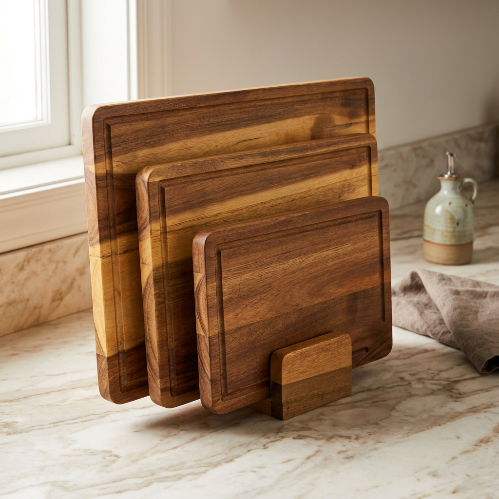 The set includes three acacia chopping boards in a range of practical sizes for everyday prep, serving, and kitchen use.