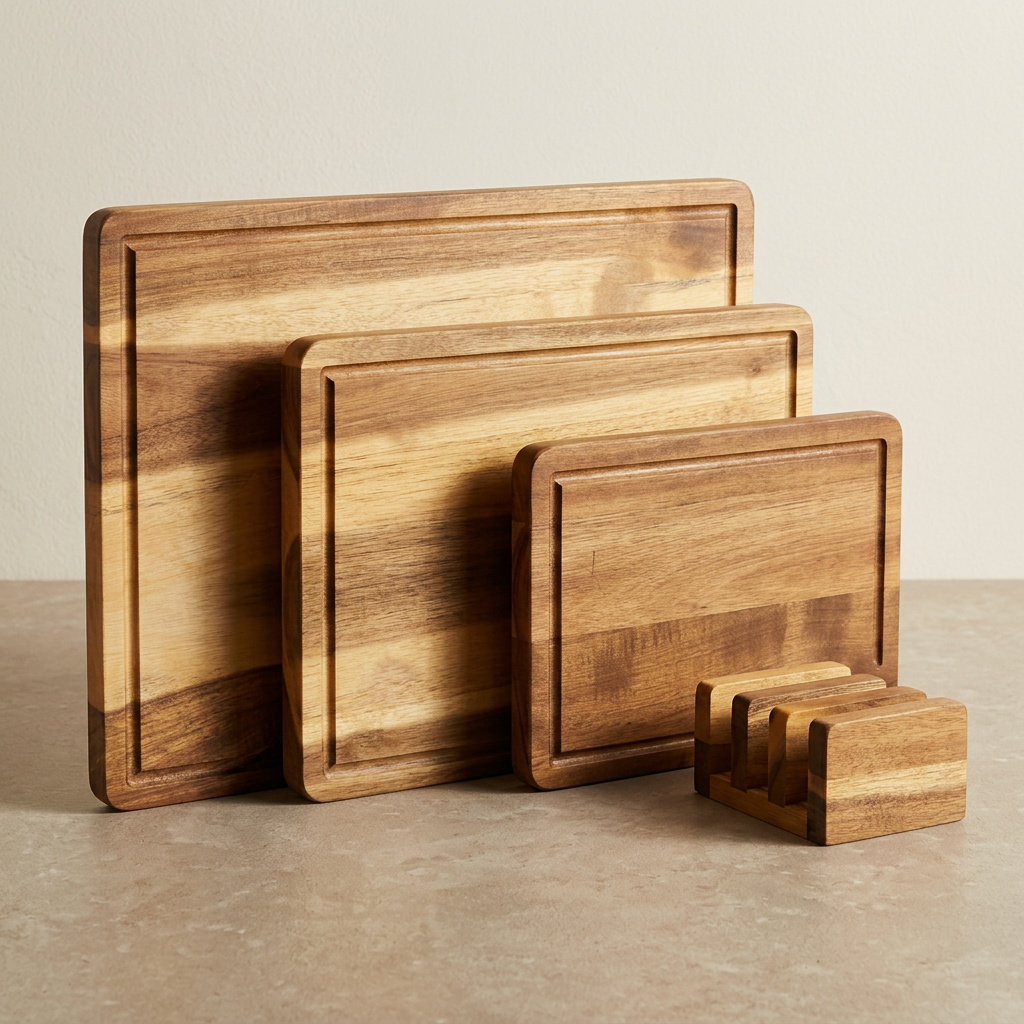 Acacia is a durable hardwood chosen for everyday kitchen use.